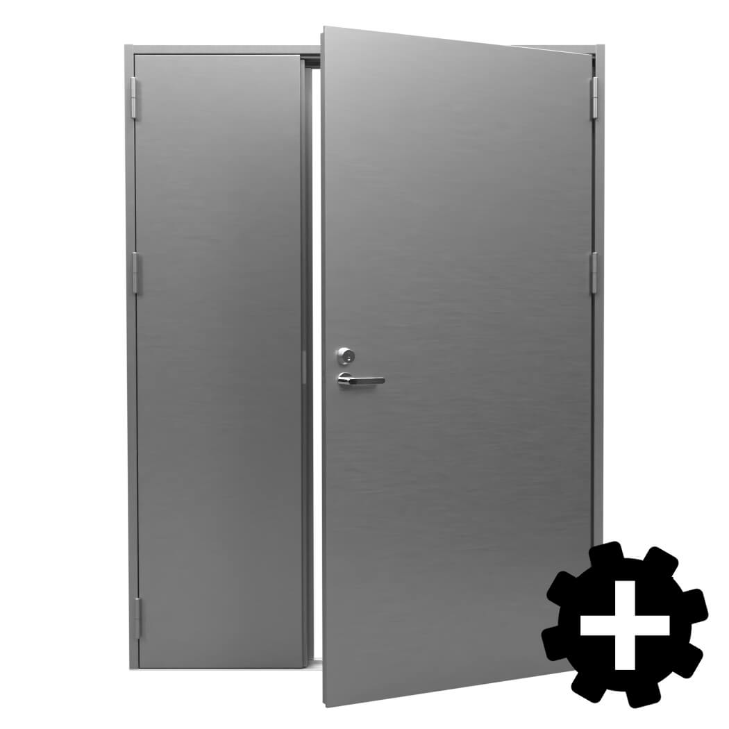 Toimitus sisältää haponkestävästä teräksestä valmistetun parioven karmeineen valituilla tiedoilla sekä lisävarusteilla.