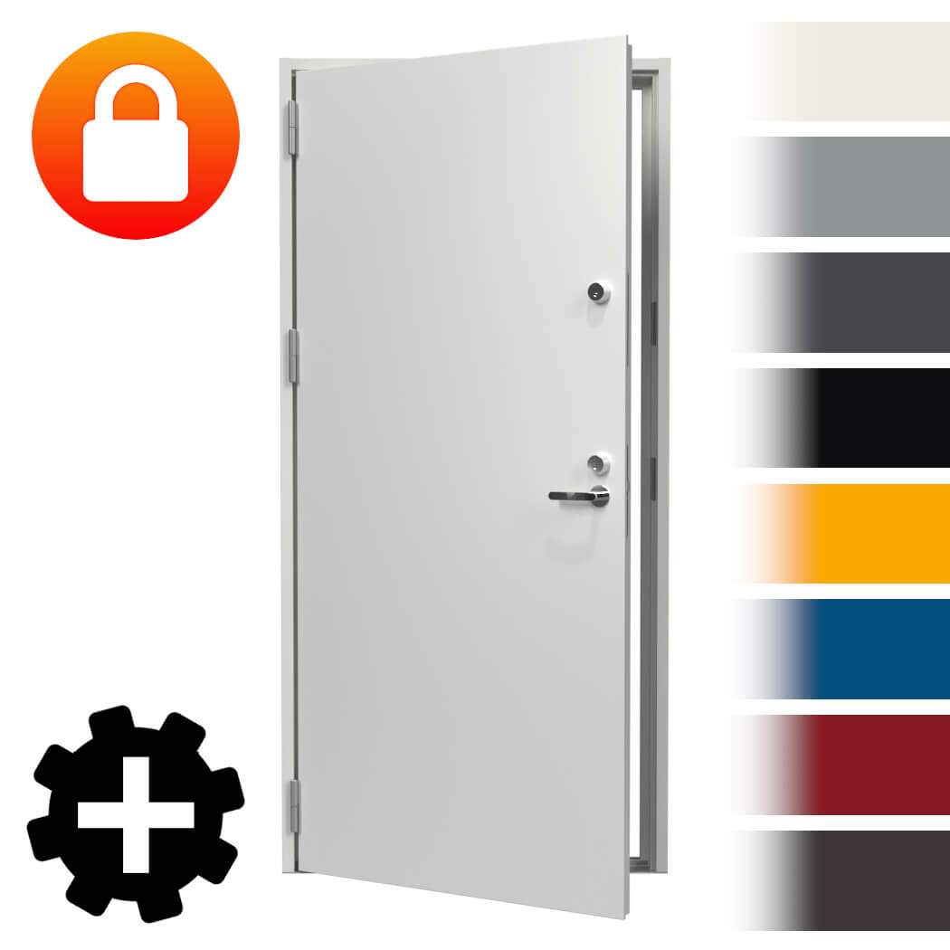 Toimitus sisältää pintamaalatun murronsuojaoven karmeineen valituilla tiedoilla sekä lisävarusteilla.