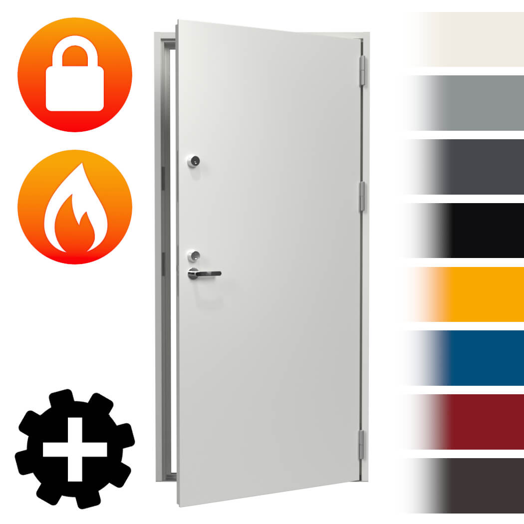 Toimitus sisältää pintamaalatun, paloluokitetun murronsuojaoven karmeineen valituilla tiedoilla sekä lisävarusteilla.